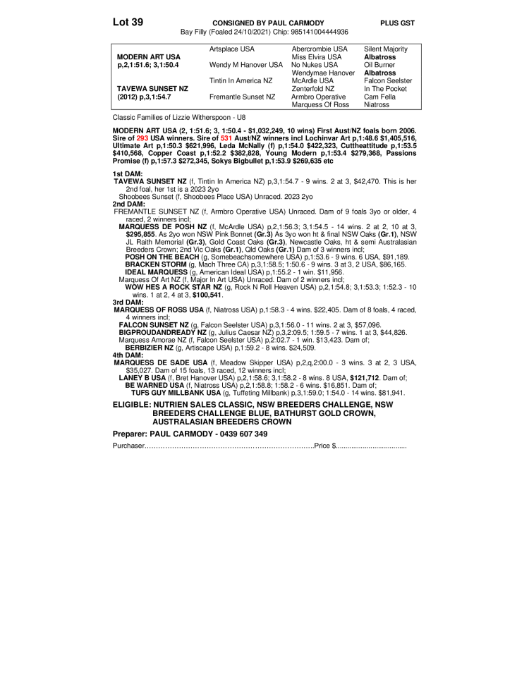2021 FILLY OUT OF TAVEWA SUNSET NZ